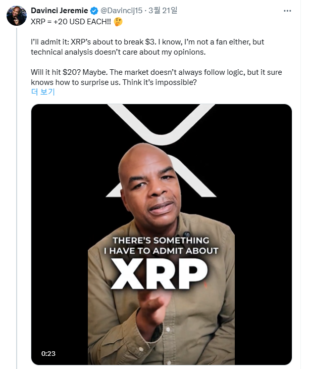 다빈치 제레미는 해당 포스트에서 XRP가 3달러를 돌파할 가능성이 높으며, 심지어 20달러까지 상승할 수도 있다고 주장했습니다. 그는 "기술적 분석은 나의 의견과 상관없이 움직인다"며, 시장이 종종 예측 불가능한 방식으로 작동한다고 설명했습니다. 이는 그가 과거 XRP에 대해 강한 부정적 입장을 보였던 것과는 대조적인 태도를 보였습니다.
